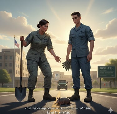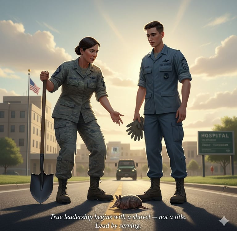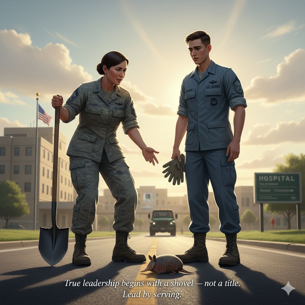 Hace años, cuando era sargento, uno de mis aviadores acababa de ganar su primer galón. Estaba nervioso. No estaba seguro de cómo liderar, cómo asumir responsabilidad y tenía miedo de cometer errores. Ese día llegó una llamada: había un armadillo muerto en la carretera que conducía al hospital. La mayoría habría llamado a mantenimiento. Yo vi una oportunidad.